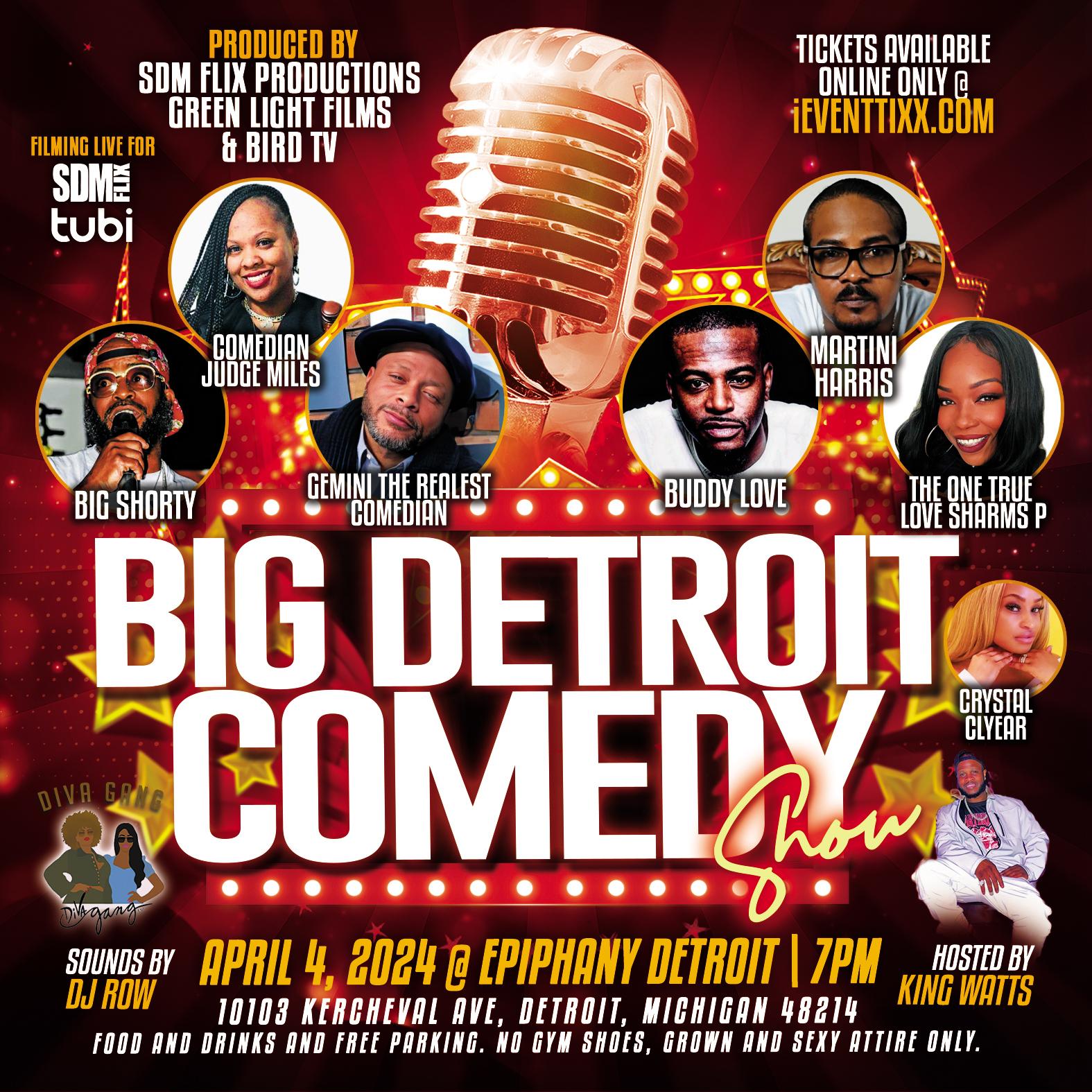The Big Detroit Comedy Show at Epiphany Detroit 10103 Kercheval Ave, Detroit, MI 48214 @ 7pm-11pm featuring Big Shorty, Martini Harris, Gemini The Realest Comedian, The One True Love Sharms P and Buddy Love, Comedian Judge Miles. Hosted by King Watts, Sounds by Dj Row. Also in the house, Diva Gang and The Health Care Comedy Tour. Produced by SDM FLIX Productions, Green Light Films and Bird TV.